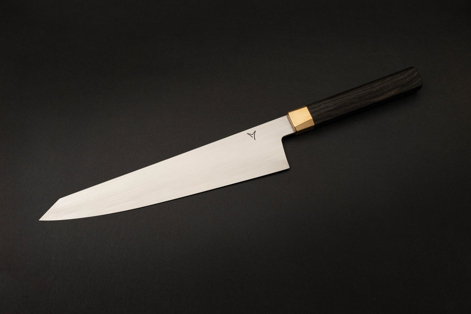 The handle is made of solid brass, birch bark and Swedish bog oak. The blade is ground with a slight wide bevel for food release and the edge flexes against the nail.