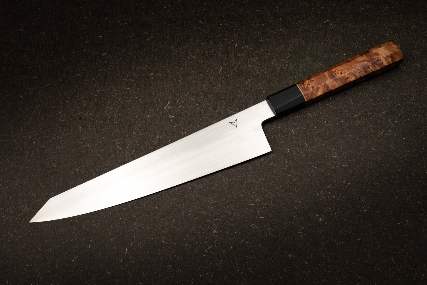 The handle is made of ebony, birch bark and alder root. The blade is ground with a slight wide bevel for food release and the edge flexes against the nail.